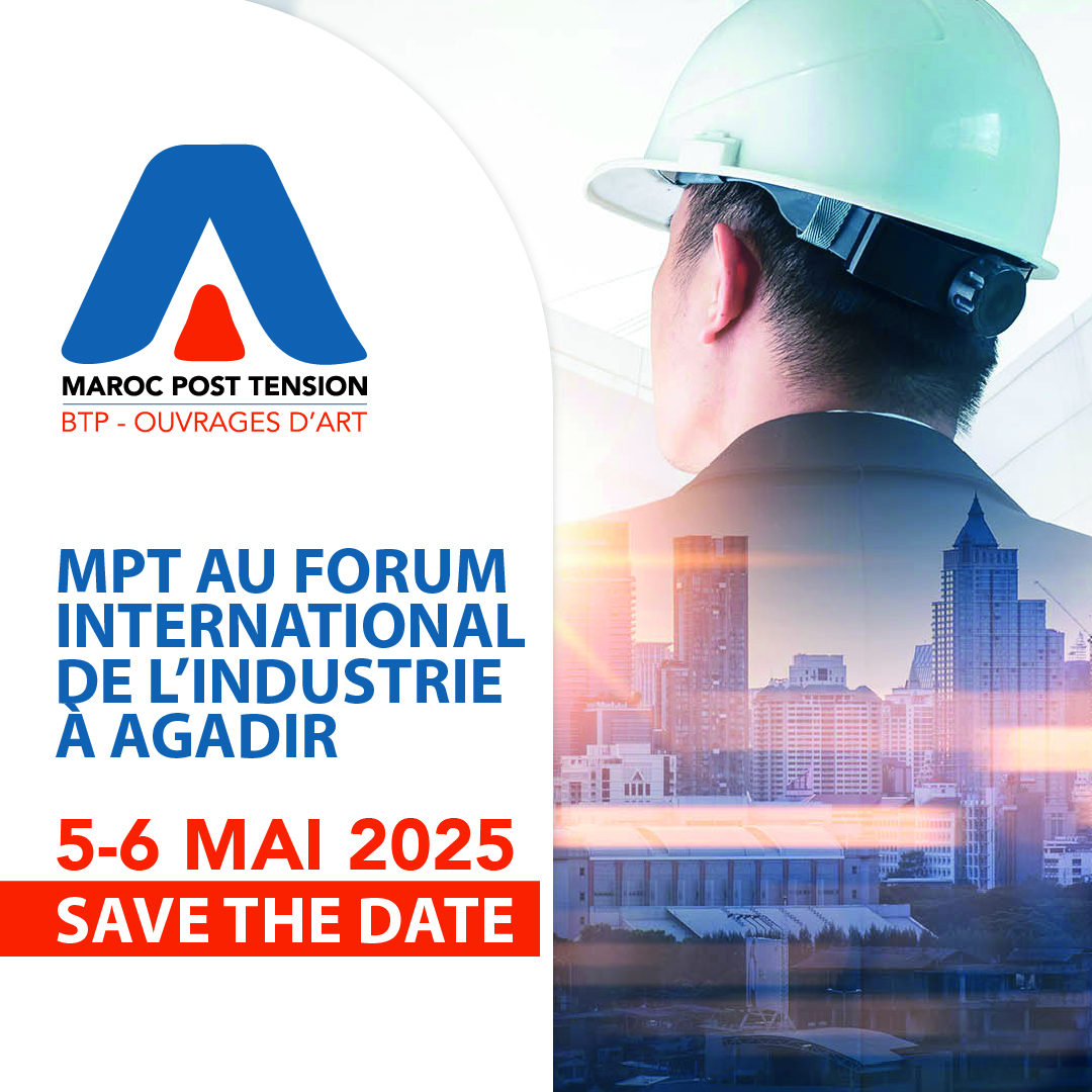 Maroc Post-Tension (MPT) est fier d’annoncer sa participation à la première édition du Forum International de l’Industrie et des Services – Souss-Massa, qui se tiendra les 5 et 6 mai 2025 à Agadir. Un rendez-vous incontournable pour les acteurs de l’industrie nationale et régionale, où MPT présentera son expertise en construction innovante . Engagés pour…